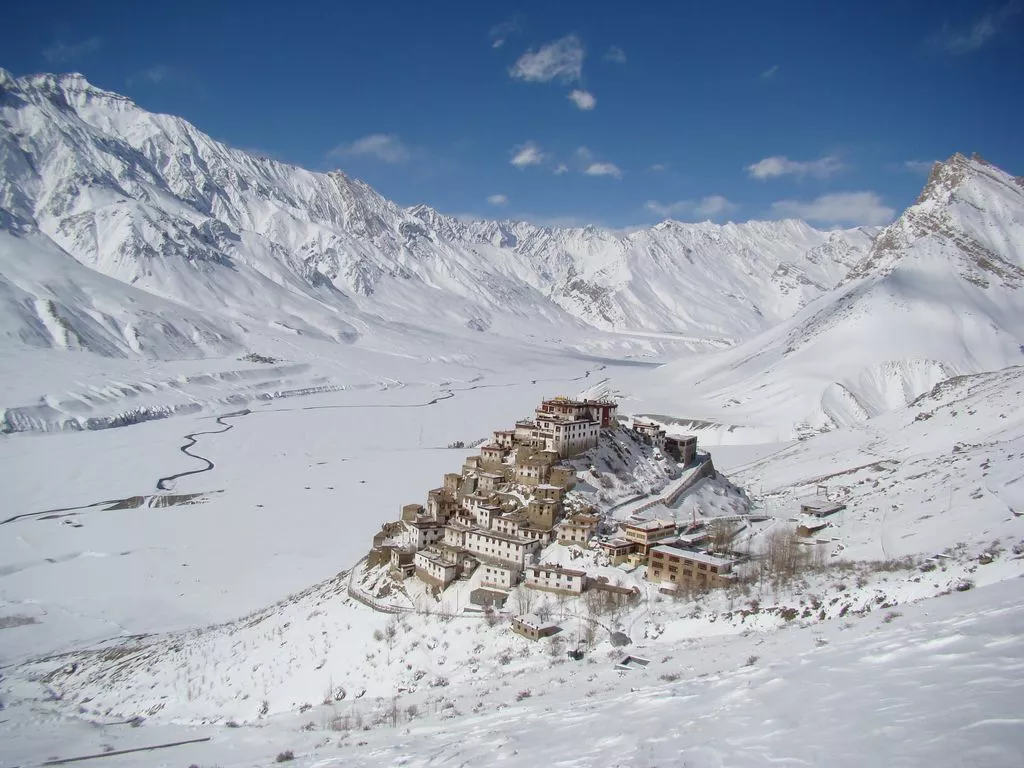 A majestic hilltop monastery with panoramic views of the Spiti River and snow-covered mountains.